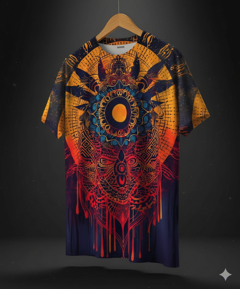 Unleash your inner spirit with our Cosmic Mandala Radiance Round Neck T-Shirt, a true masterpiece of wearable art. This premium cotton blend tee features a breathtaking all-over graphic print that marries intricate details with a stunning burst of color.