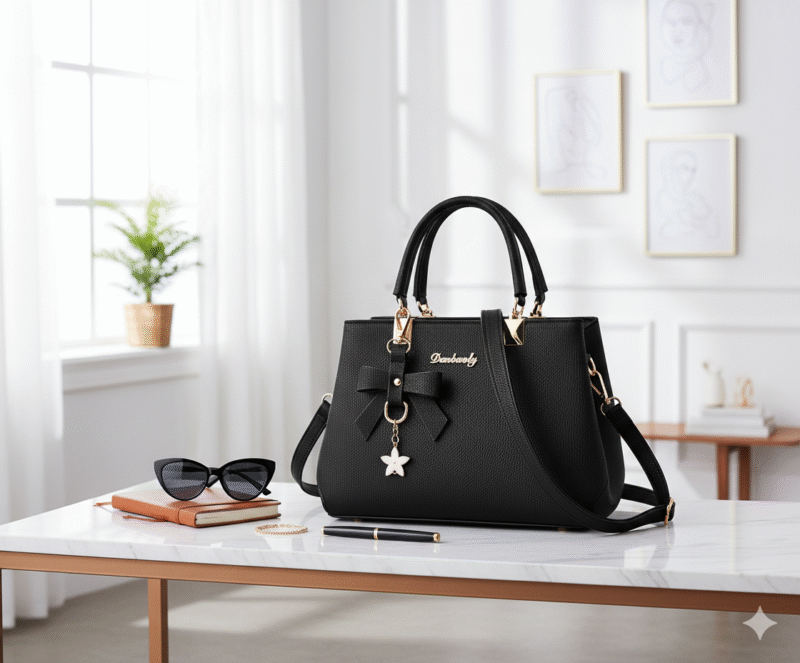 “The Ultimate Structured Black Satchel. Crafted from sleek vegan leather, this bag offers dual-carry versatility with its top handles and detachable strap. Finished with glamorous gold-toned hardware and a chic tassel accent, it’s the perfect accessory for effortless elegance, from the office to the weekend.”